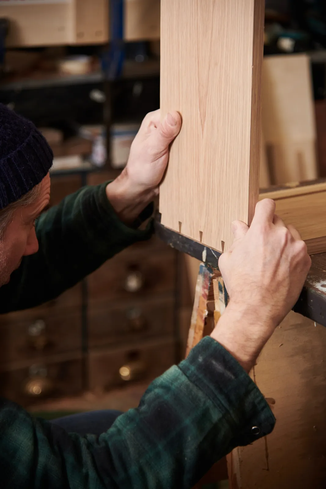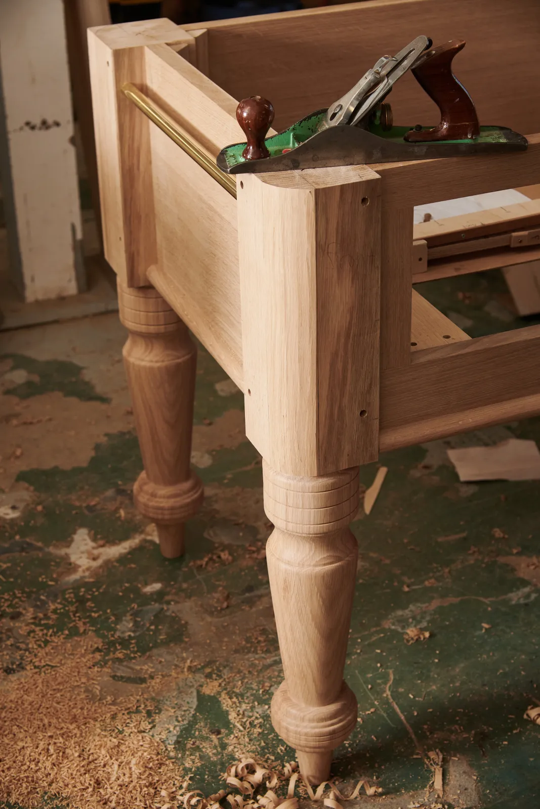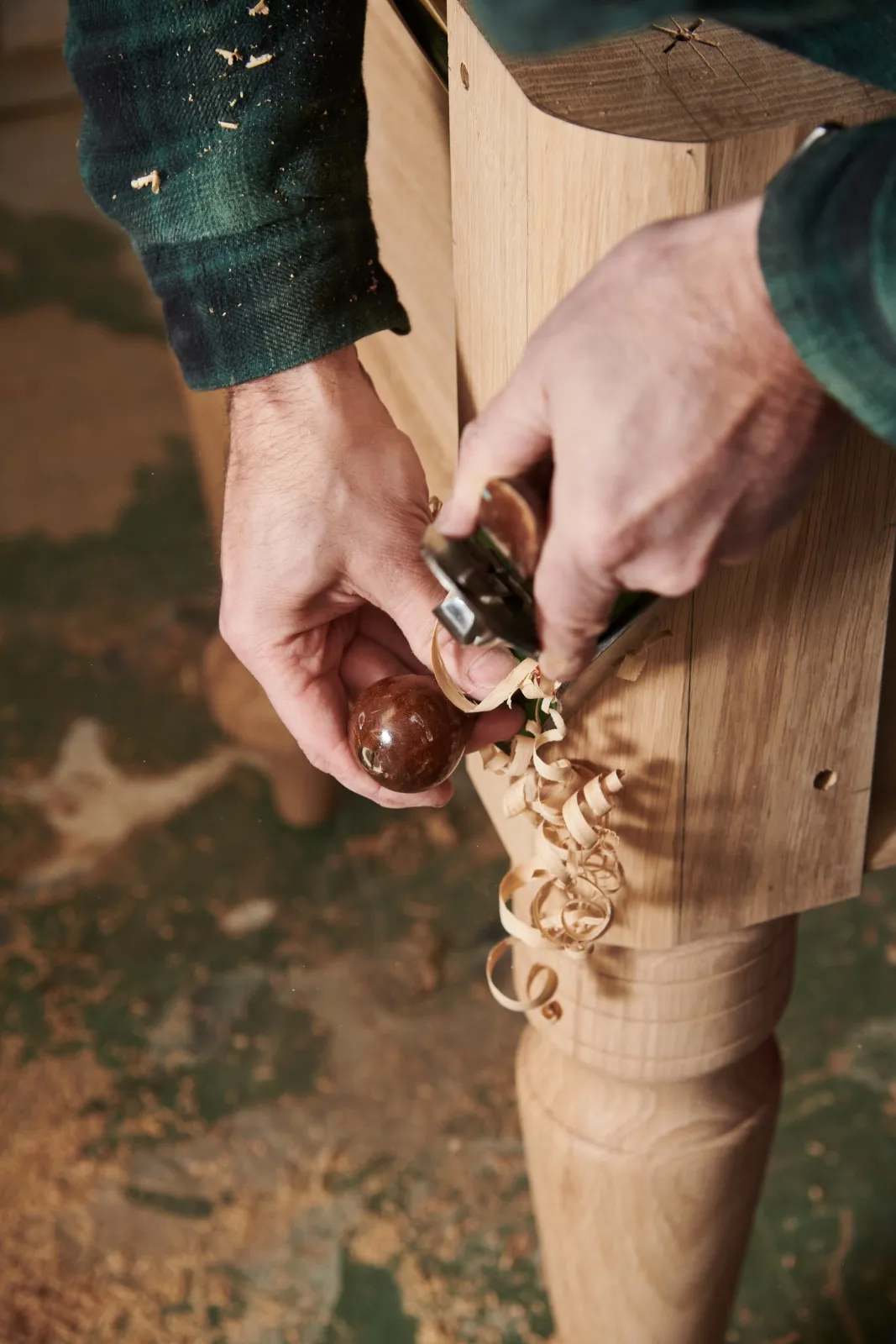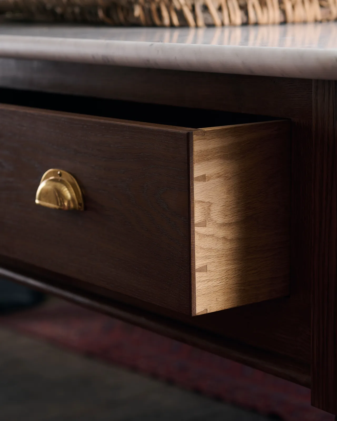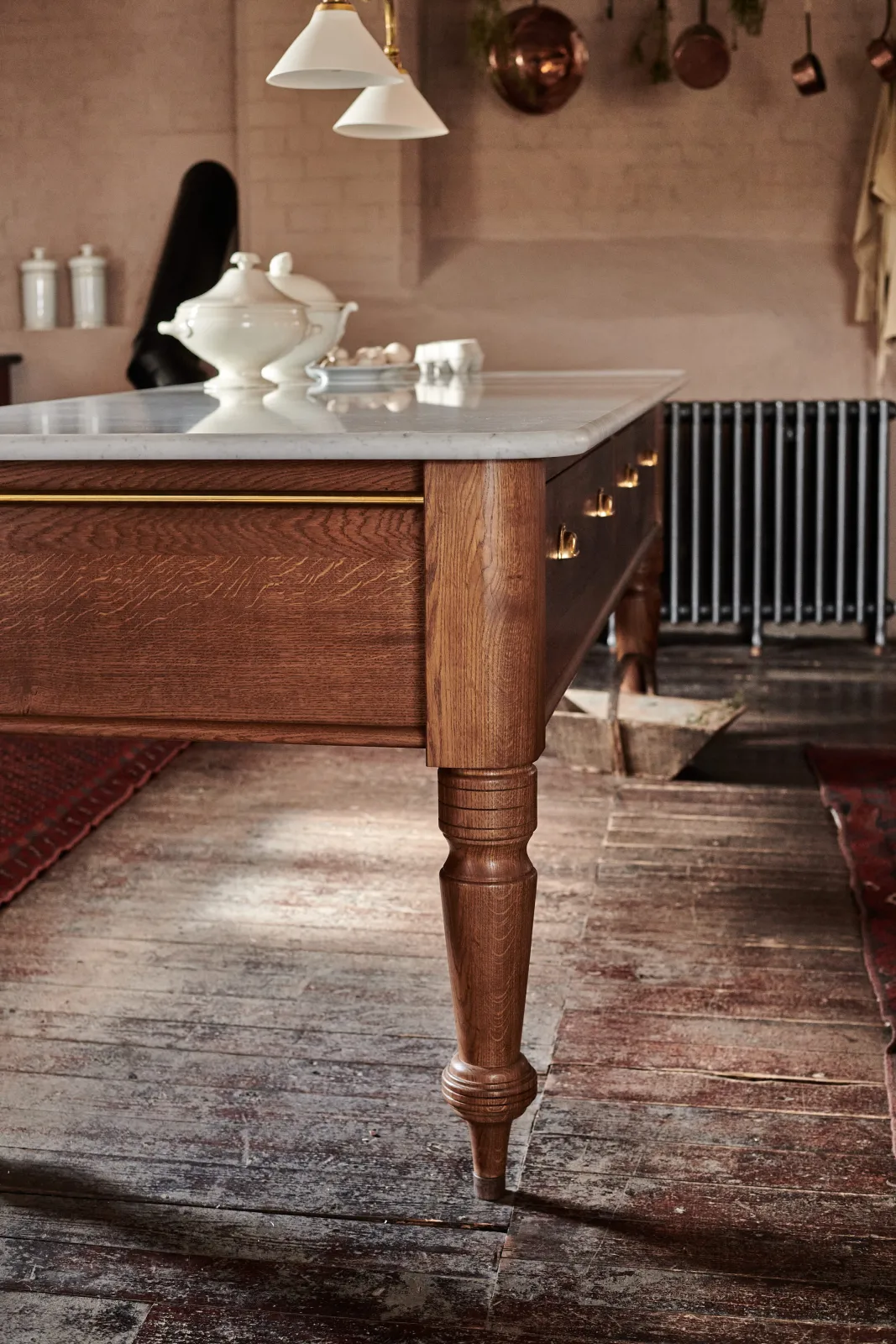 Made from richly stained European oak, this table is quite the statement, but, as is our way, also very understated. Hand-turned legs, hand-cast solid brass handles and a smooth, cool Carrara marble worktop that has a beautifully rounded edge. It will sit comfortably with all our furniture ranges but will also work with an existing kitchen as a standalone piece. The big deep drawers and scale of the piece means it works really well in large spaces and would definitely bring a certain kind of class to a room. We imagine it laden with produce and being the go-to spot for pretty much everything that happens in a kitchen, from kneading dough to having a party. This is the piece that everyone will gravitate to whatever time of day it is, they will fall in love with its shape and realise they pretty much couldn’t live without it.