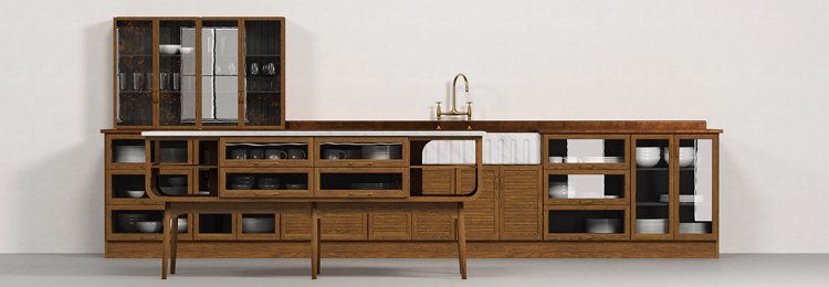 It was clear straight away that we wanted to retain the mid-century style and unique design features like the curved oak frames and metal end panels but this time our inspiration came from old gentlemen’s haberdasheries. Instead of coloured solid surface doors and brushed aluminium end panels we have opted for a beautifully natural stained oak finish and aged copper ends. A mixture of narrow framed glazed doors and drawers with dark painted interiors and tambour-style solid doors make up the main run of the kitchen, whilst the island features glazed drawers, open curved ends and beautiful oak turned legs.
