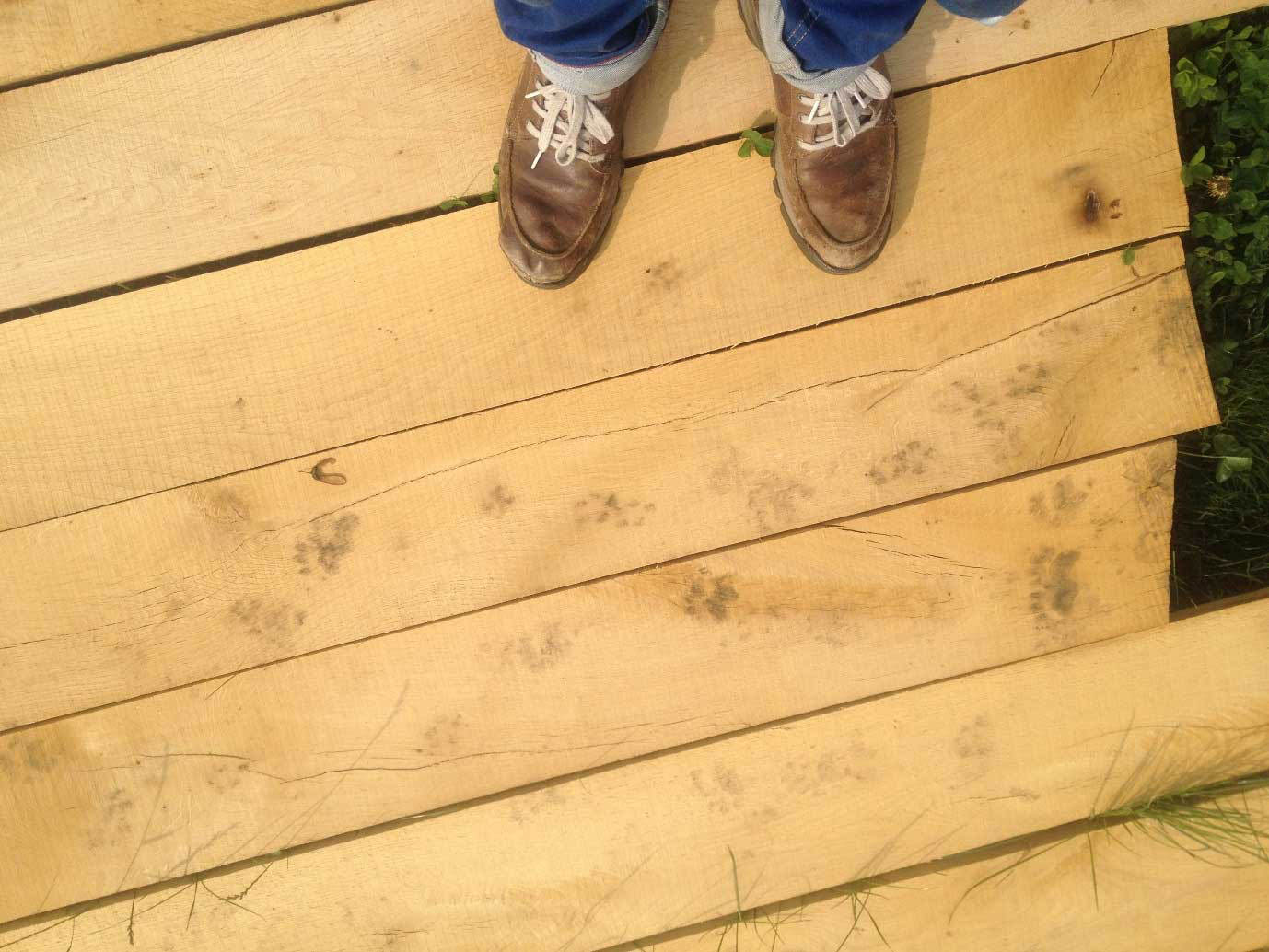 We left the green oak boards on bearers, all laid out on the grass, being rained on, drying and bleaching in the sun, over and over for 3 months; and walked on by foxes I think. I like green oak when it’s freshly sawn and when it’s weathered and silvery, but I hate it when it’s half way there; especially when that takes 20 years. Some oak inevitably gets washed and dried all the time, whilst other parts don’t, like under the eaves of a green oak porch, so you have tannin stains half way down. We’re all pretending that that’s authentic; it might be, but it’s also ugly. With the big overhang on the roof, the top boards would get no weathering, so I needed to, at least, part weather them before they were fitted.