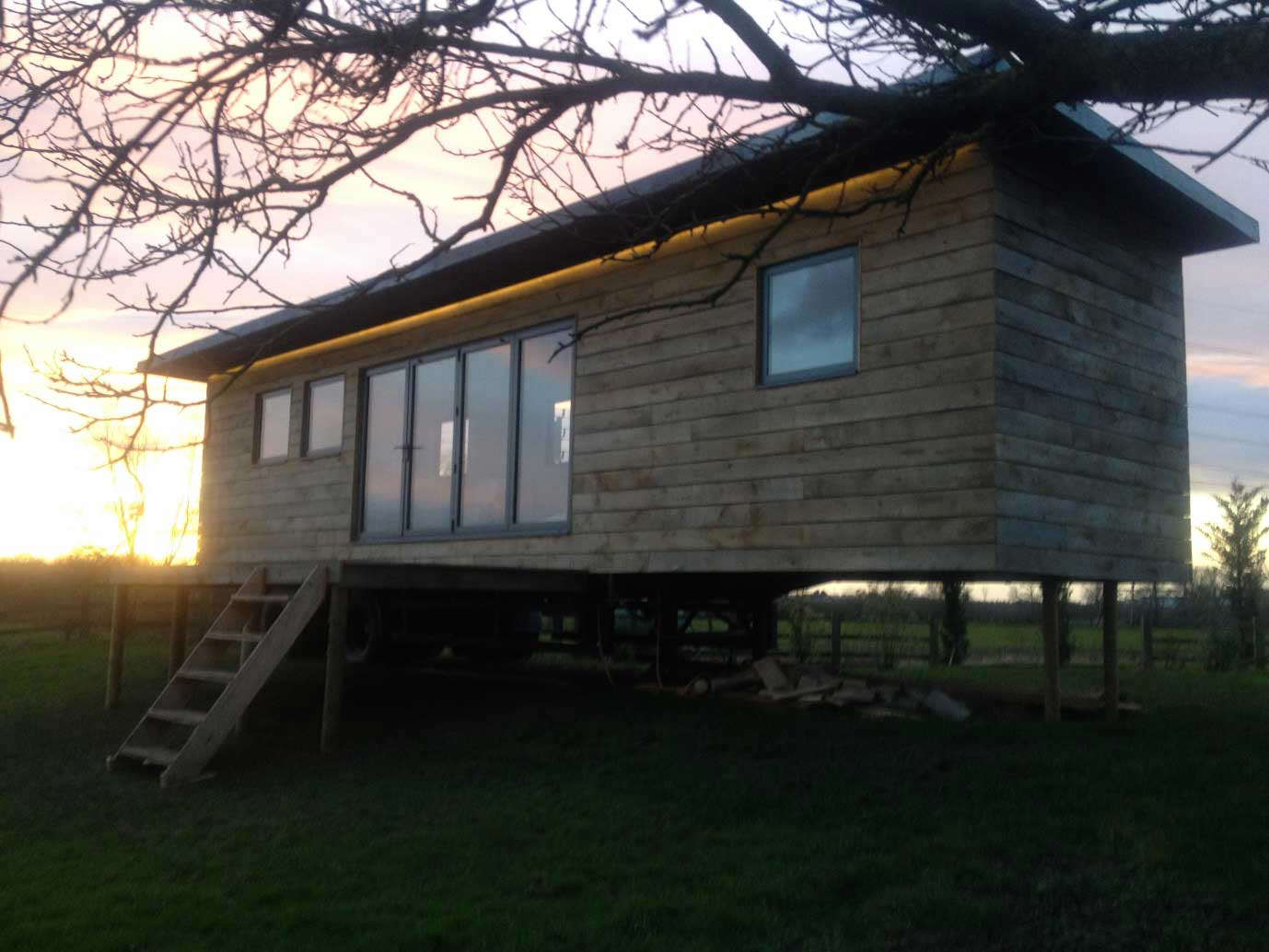 The interior was coming along, we used tongue and groove on the wall and cheap clip together flooring on the ceiling, and, instead of tiles in the shower, we used Corian. Everything was designed to take movement. Best of all, Phil fitted the wood-burner and we had plenty of off cuts to burn. As summer turned to autumn, the cabin proved to be very warm and cosy. All the stud walls, the ceiling and floor all had rockwool slotted in and when the sun shone through those doors the cabin heated up fast.