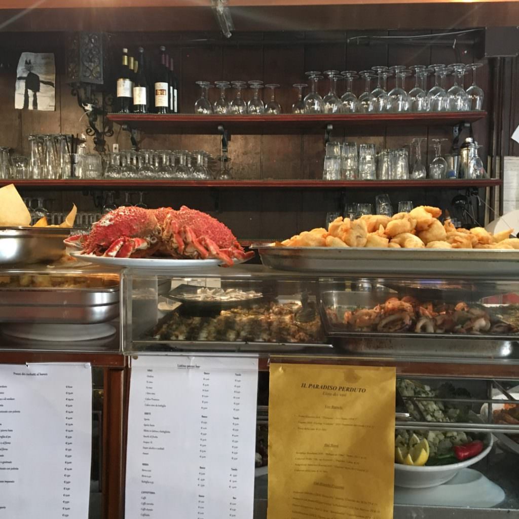 So you may have wondered earlier what a Baccari is? Well it’s a little tiny bar or local small restaurant in a Venetian backstreet. They are small humble and simple places where locals meet to drink, eat titbits and just have a gossip, what a wonderful idea. They are renowned for being frequented by everyone from the doctors to the street workers, all eating the same food and enjoying the easy nip in and out style of these tiny places. An Aperol Spritz is so so popular but also small tumblers of really good red wine are very acceptable at any time of the day. The bar is always small often a bit tatty looking but always busy. There is always a glass fronted display area on or around the bar showing an assortment of pretty fresh little crostini, all topped with selections of fish, vegetables or meat. There will also be cooked vegetables and cheeses, fishes and deep fried stuff on offer. You don’t really know what most of it is so you just point at a few in a knowledgeable fashion, they pop them on a plastic plate and you take them outside with your wine, sit on the wall of the canal or a little wooden table and while away 1/2 hour before moving on to the next one. The little morsels are called Chicheti and at 1 euro a piece you can try lots. The Venetians like tuna and salt cod so there are lots of them, perfect little mouthfuls to explore.