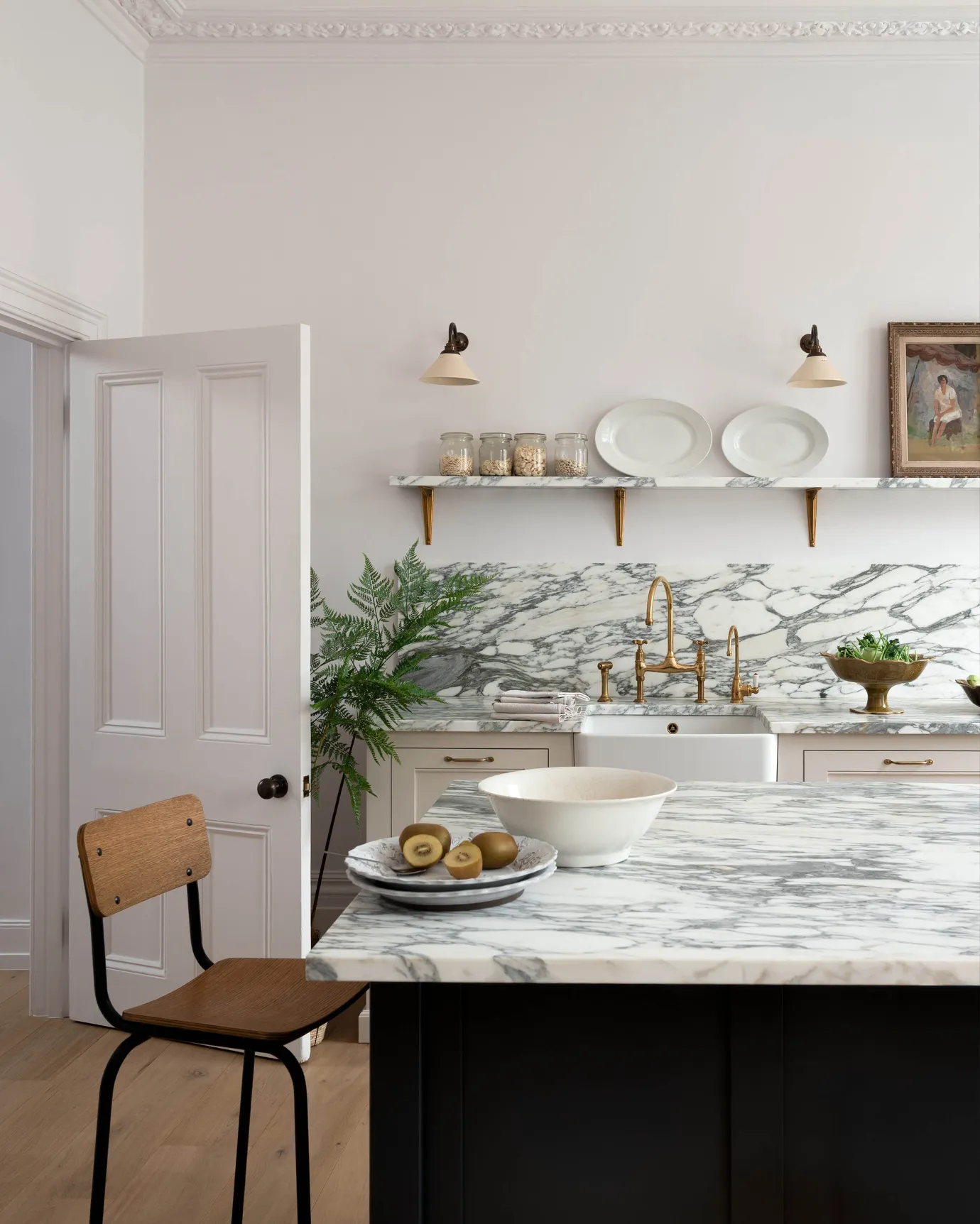 A Victorian house, beautiful stone steps up to a grand front door and a tree lined crescent, that’s the home to this rather splendid Classic English Kitchen. Downstairs, below street level the family have created a complete living space with views onto an urban garden designed and planted to attract birds and wildlife. The Kitchen is spread out over four areas, a huge Aga is the centre of the cooking area and a simple island with bespoke wooden worktops houses dishwashers and bins. A wall of glazed base and wall cupboards creates a very traditional style of storage for a Victorian home. Finally, a little corner of the room designated to laundry and utility jobs, what a wonderful room to entertain and host parties in. Wow, we love this new Classic Kitchen.