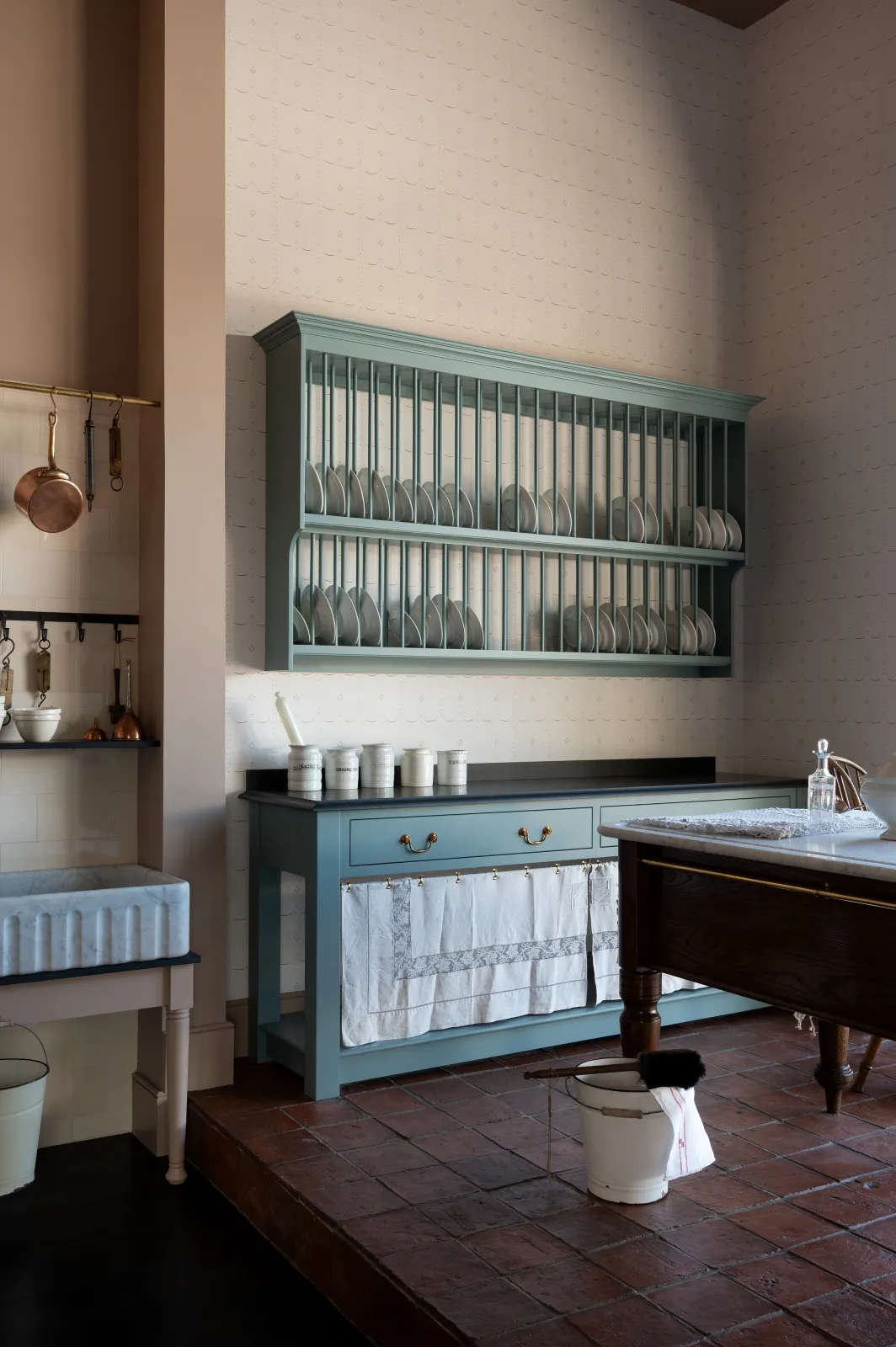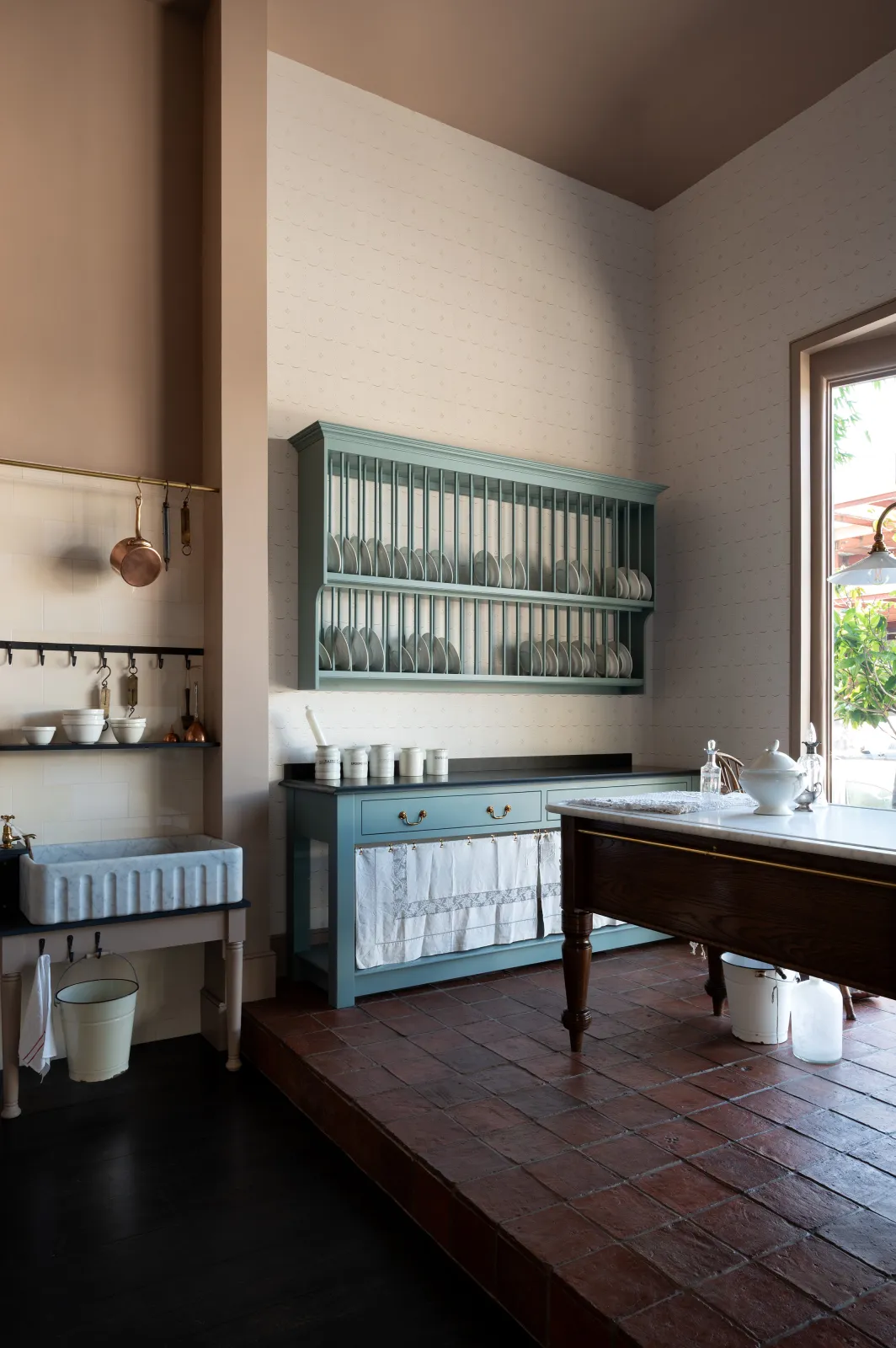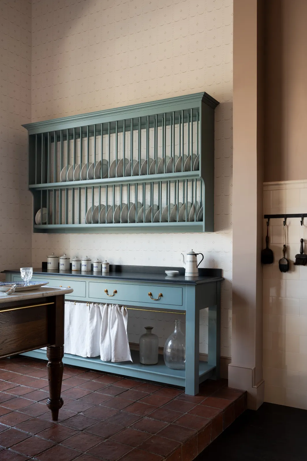 This very simple display shows a space that is quintessentially English, with its terracotta tiled floor, Dairy Table, open cupboards and delightfully organised plate racks. The walls have been covered in our Ditsy Delft Wallpaper, subtle and clean and the perfect ‘hardly there’ backdrop to the Trinity Blue cupboards and simple styling. Traditional and classic yet somehow totally new and inspirational, we love the idea of swapping our cosy English kitchens for palm trees and sunshine kitchens.