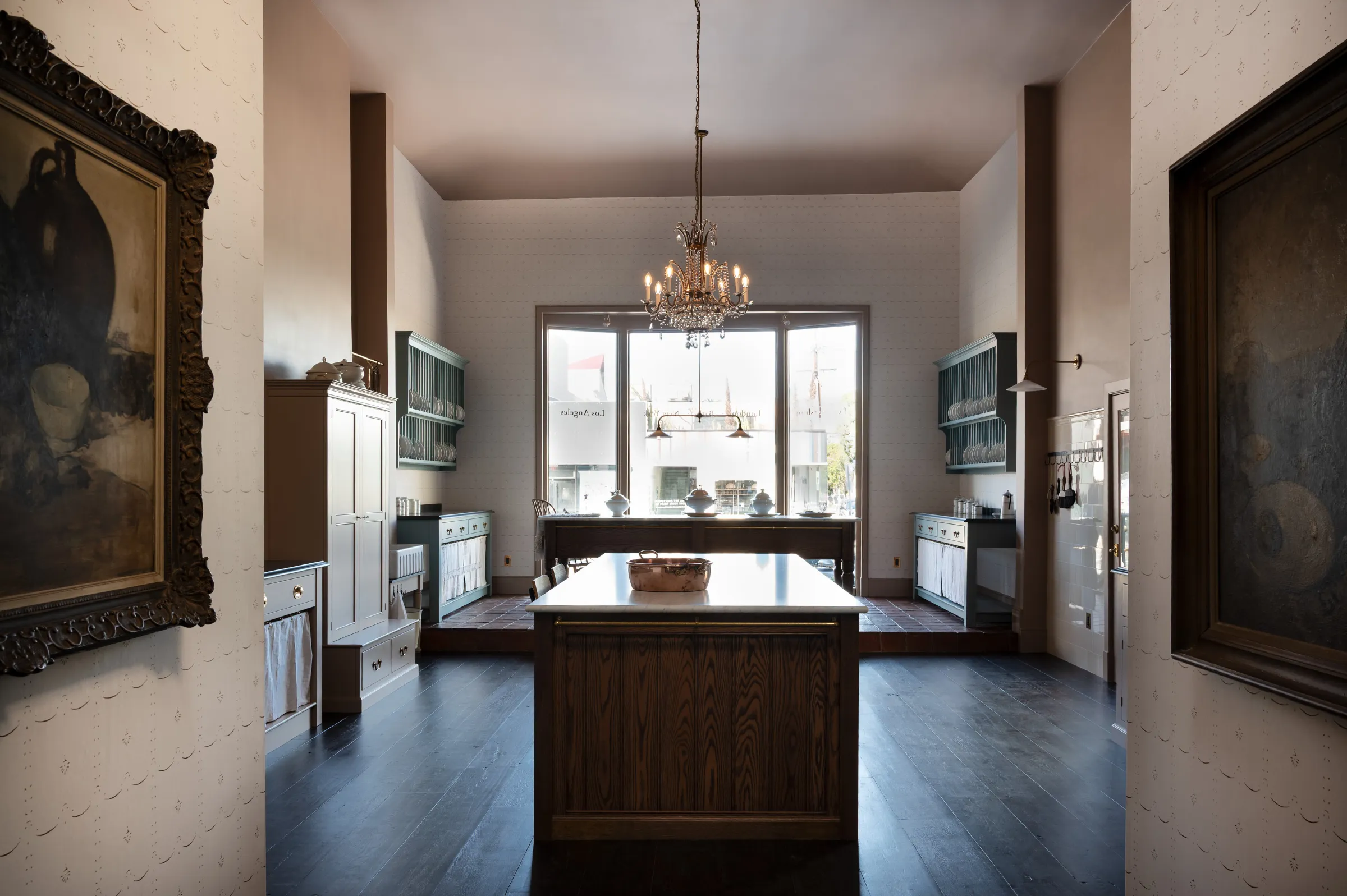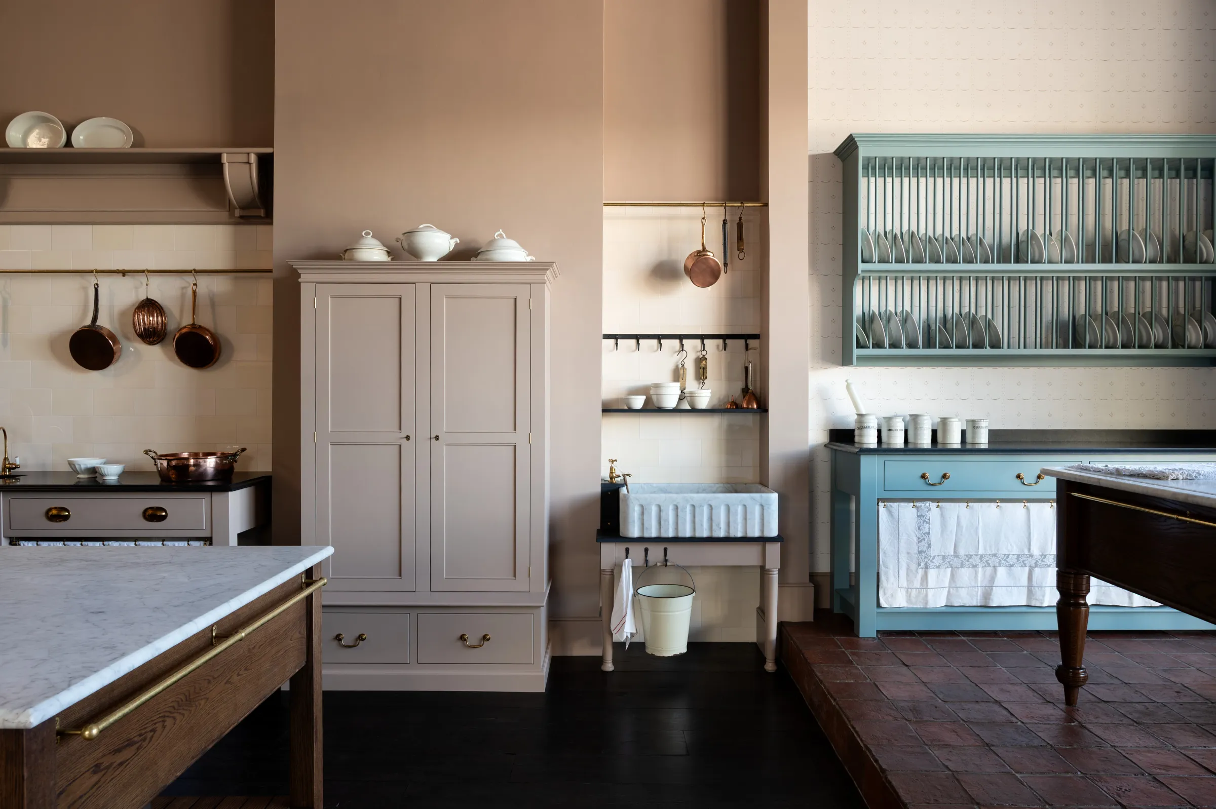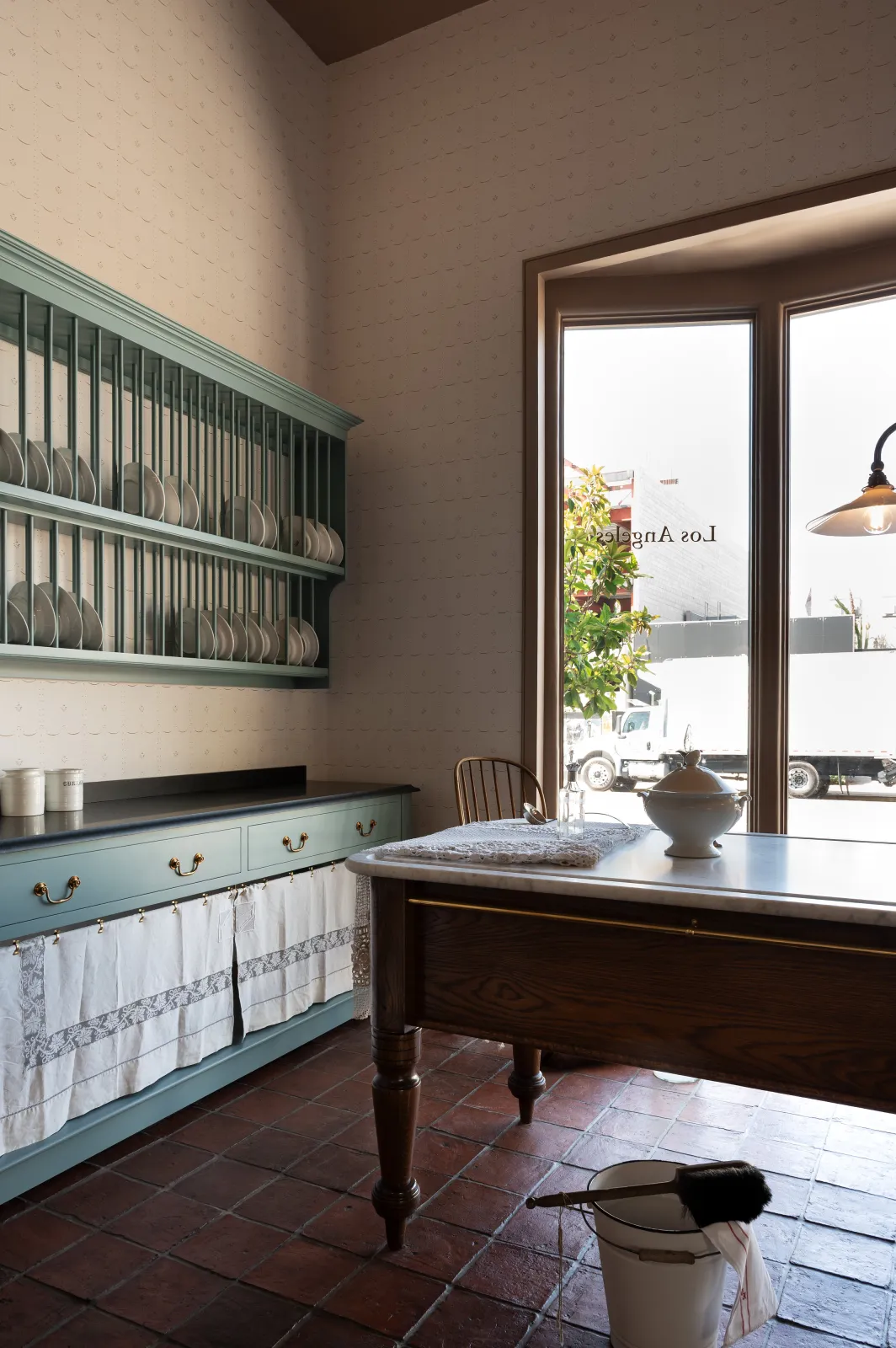 This very simple display shows a space that is quintessentially English, with its terracotta tiled floor, Dairy Table, open cupboards and delightfully organised plate racks. The walls have been covered in our Ditsy Delft Wallpaper, subtle and clean and the perfect ‘hardly there’ backdrop to the Trinity Blue cupboards and simple styling. Traditional and classic yet somehow totally new and inspirational, we love the idea of swapping our cosy English kitchens for palm trees and sunshine kitchens.