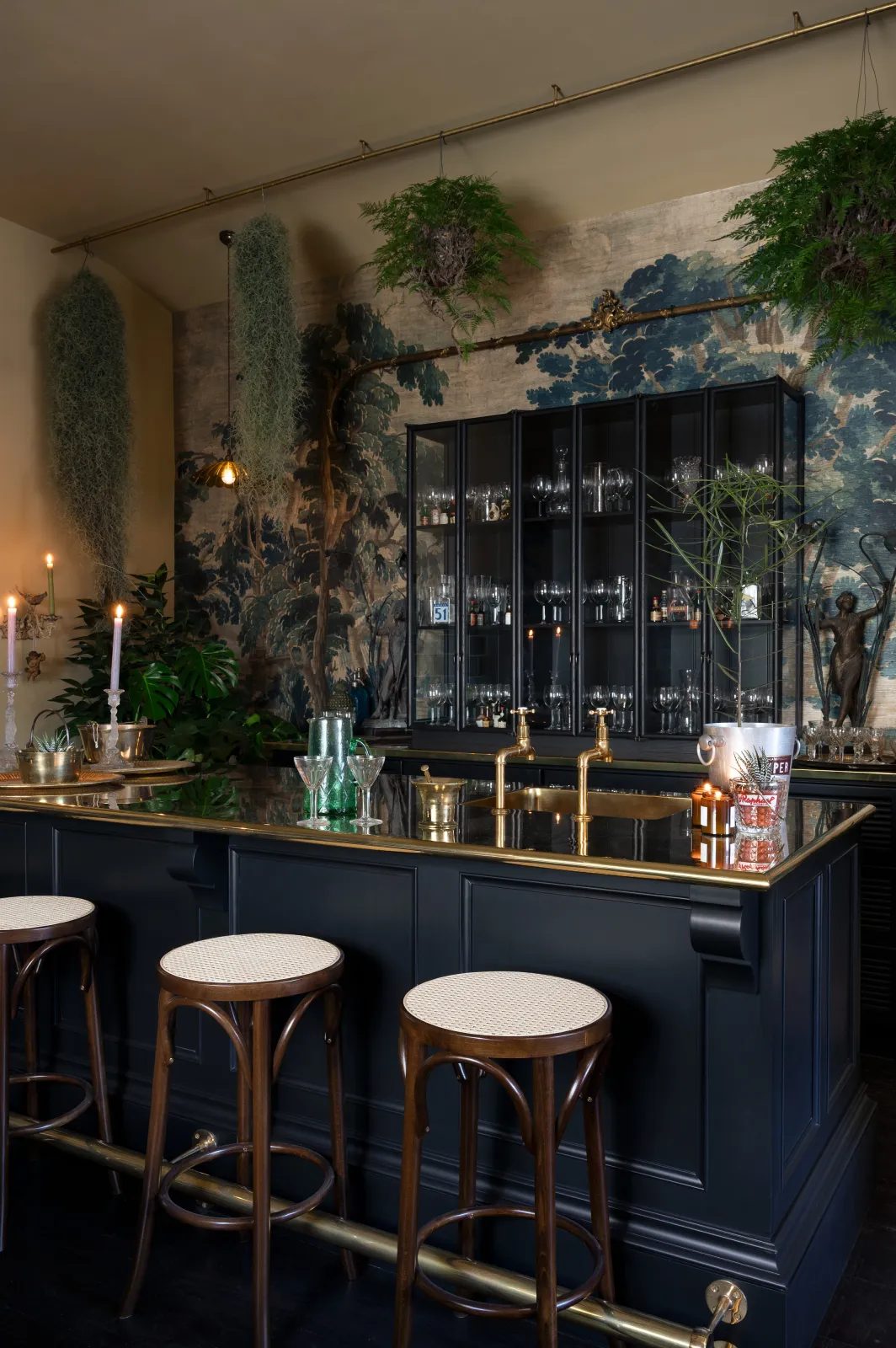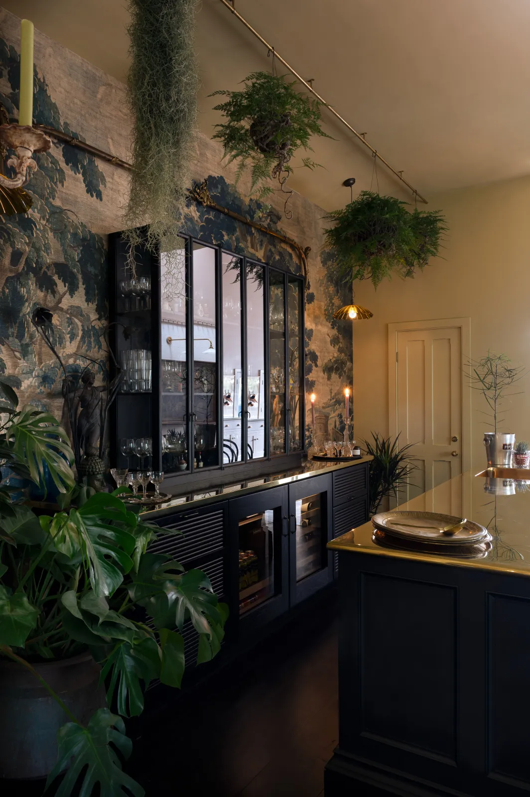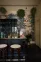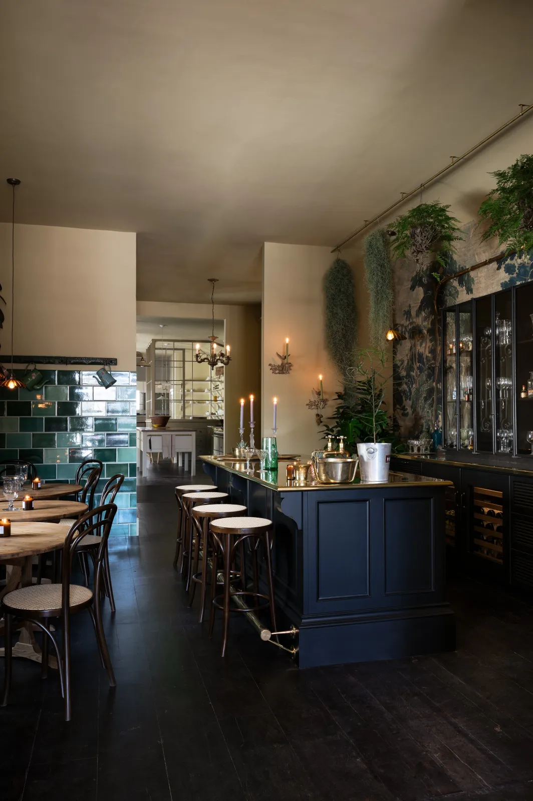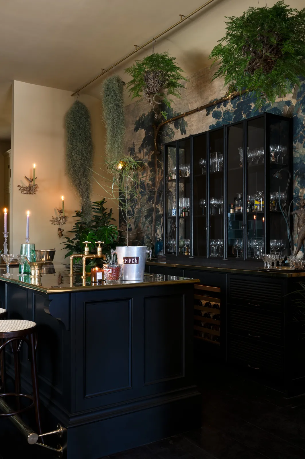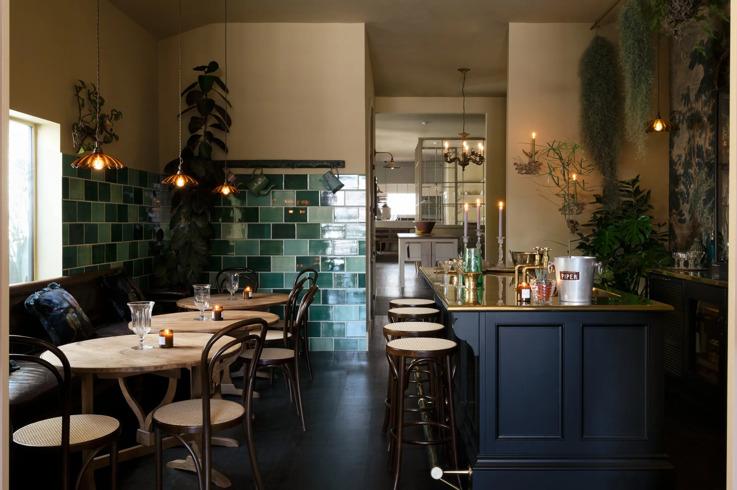 The tall, glazed wall cupboards and tambour base cabinets incorporate not only masses of glassware storage, but a wine fridge, a drinks cooler and recycling bins, making this area totally set up for an impromptu party or a quick nightcap before bed. Inspired by the legendary Le Coucou bar in New York, we added our Emerald Green London Tiles, Vineyard Tables and renovated an old English railway bench (bought from eBay) to complete this intimate and atmospheric room. We filled the ceilings and floor with ferns and greenery and our Frilly Chartreuse Lights, a few deVOL candles and the mood was set. We finished it all off with a curated collection of vintage bar accoutrements that we have collected over many trips to flea markets and antique fairs back home in England.