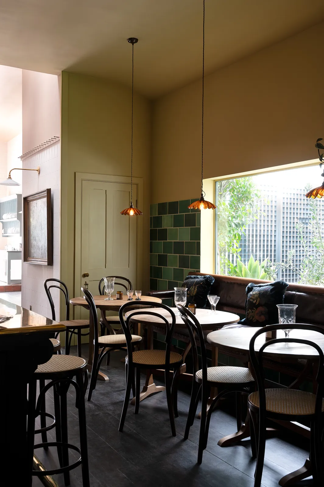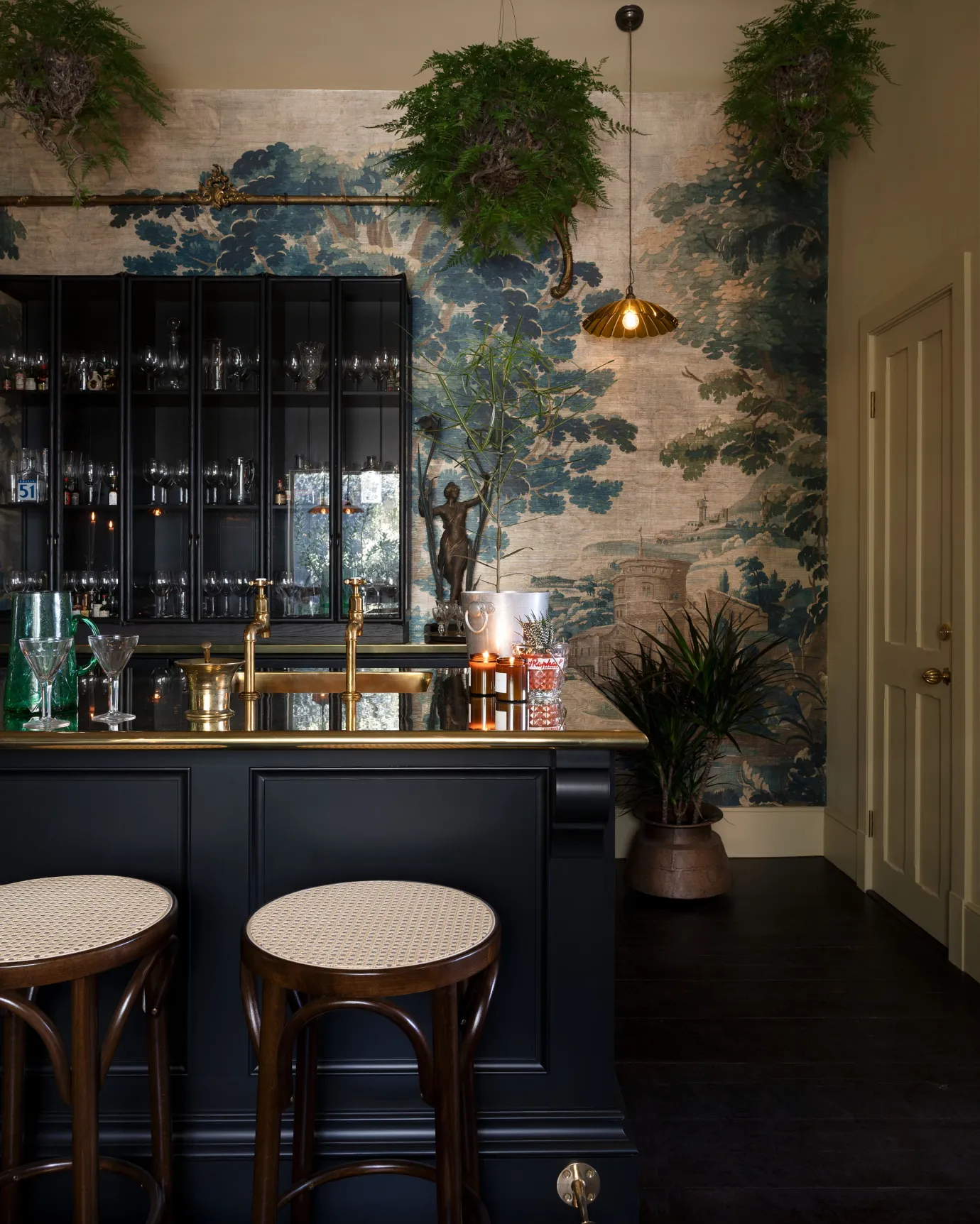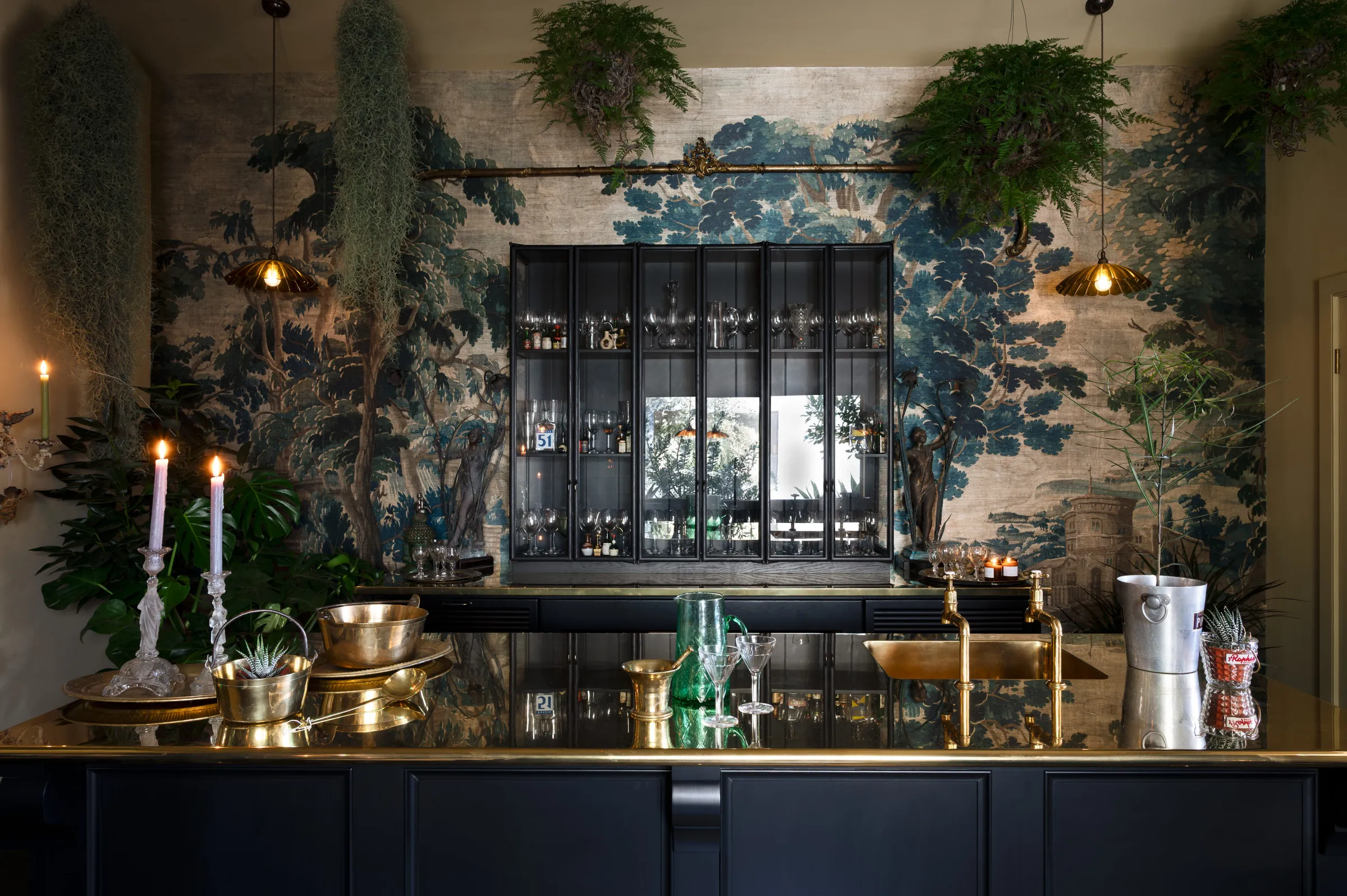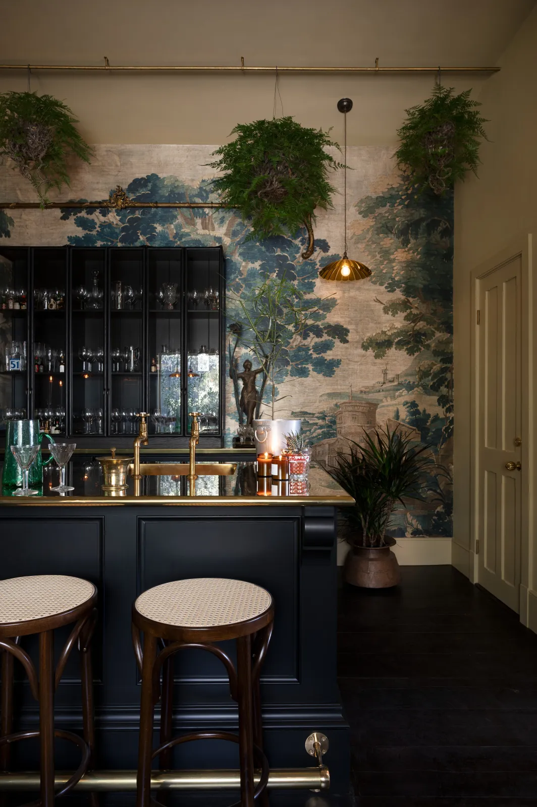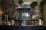 The tall, glazed wall cupboards and tambour base cabinets incorporate not only masses of glassware storage, but a wine fridge, a drinks cooler and recycling bins, making this area totally set up for an impromptu party or a quick nightcap before bed. Inspired by the legendary Le Coucou bar in New York, we added our Emerald Green London Tiles, Vineyard Tables and renovated an old English railway bench (bought from eBay) to complete this intimate and atmospheric room. We filled the ceilings and floor with ferns and greenery and our Frilly Chartreuse Lights, a few deVOL candles and the mood was set. We finished it all off with a curated collection of vintage bar accoutrements that we have collected over many trips to flea markets and antique fairs back home in England.