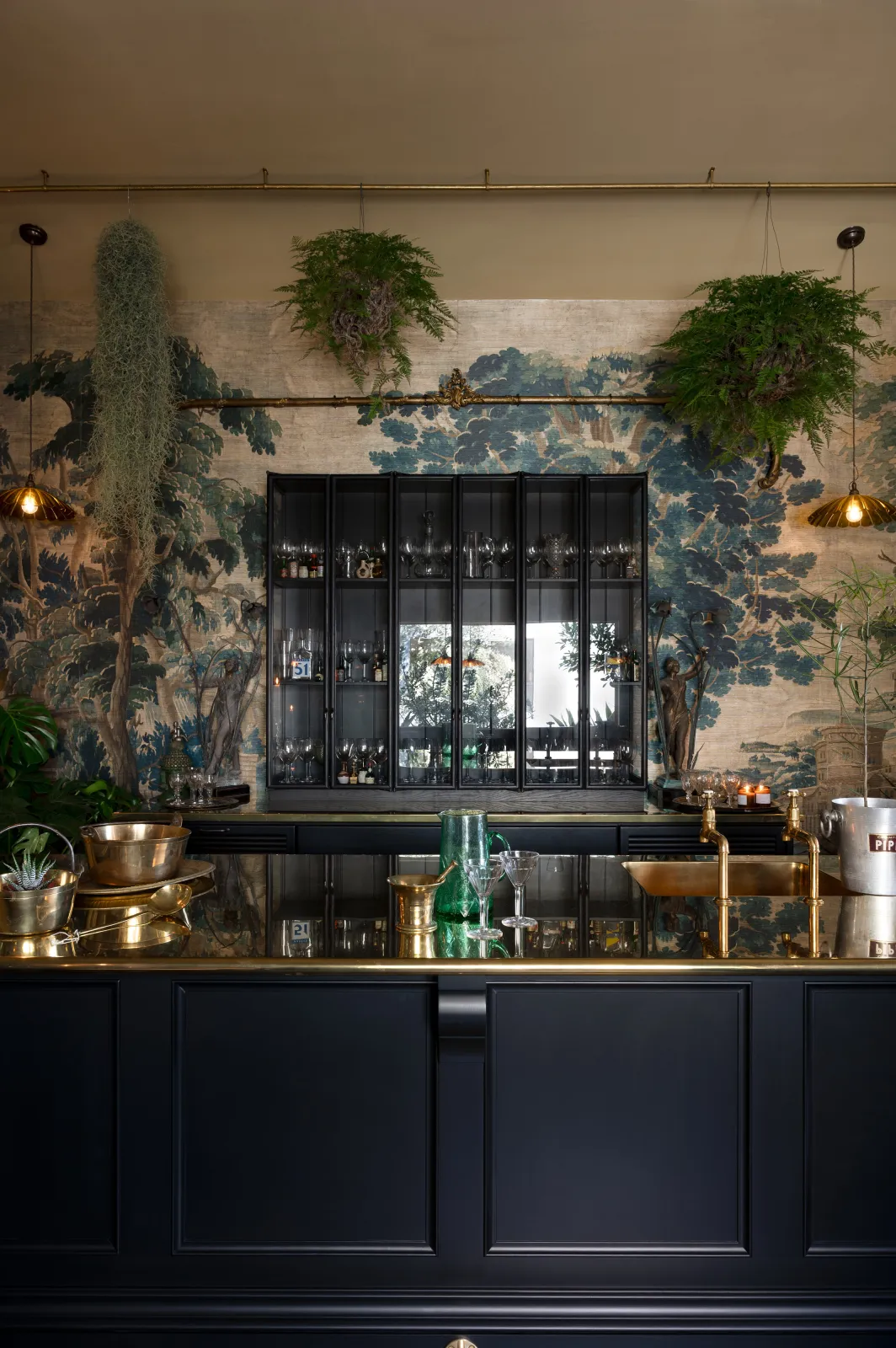 The cupboards in our LA bar are from the deVOL Haberdasher's range - painted in ‘Bobbin Black’, they take on a whole new personality, less mid-century and more late-night chic. The Haberdasher's island, which has always incorporated a rather brilliant brass footrail, now has an equally brilliant brass worktop with deeply rolled edges and an integrated sink, making it not only beautiful but really practical too. This shiny brass countertop is new to us at deVOL, we’ve been making our much-loved aged copper worktops for many years now, but brass, that’s a whole new look.