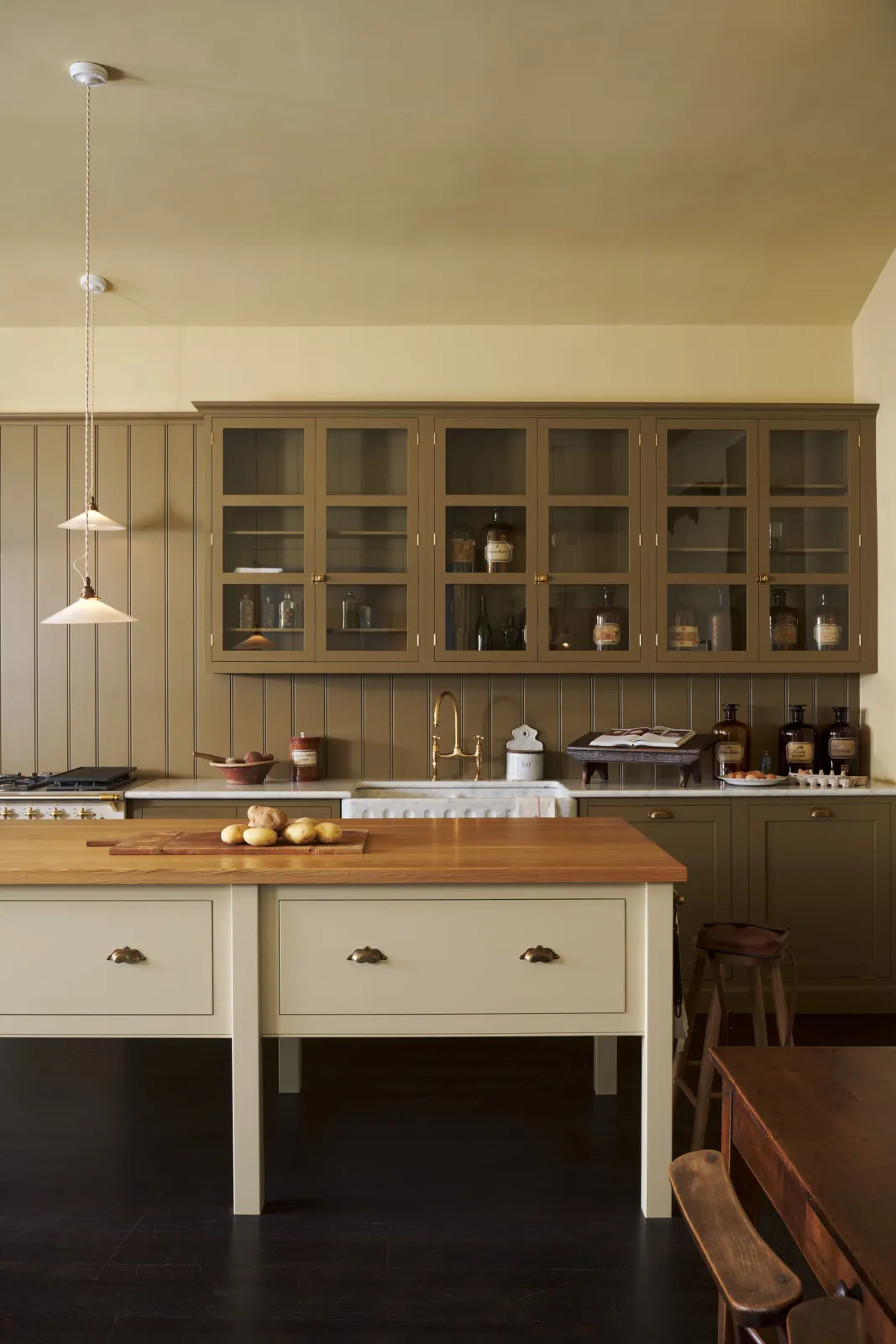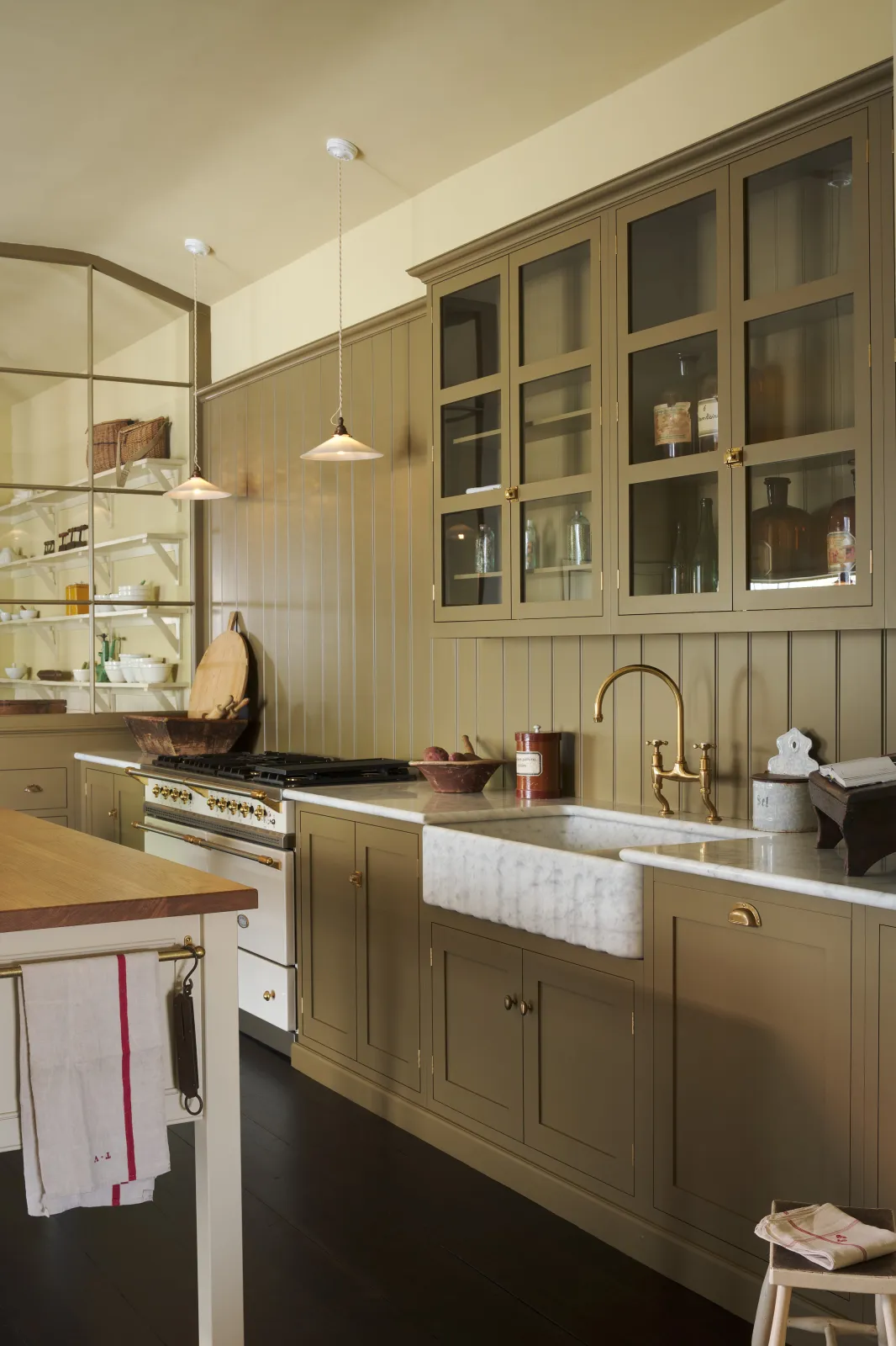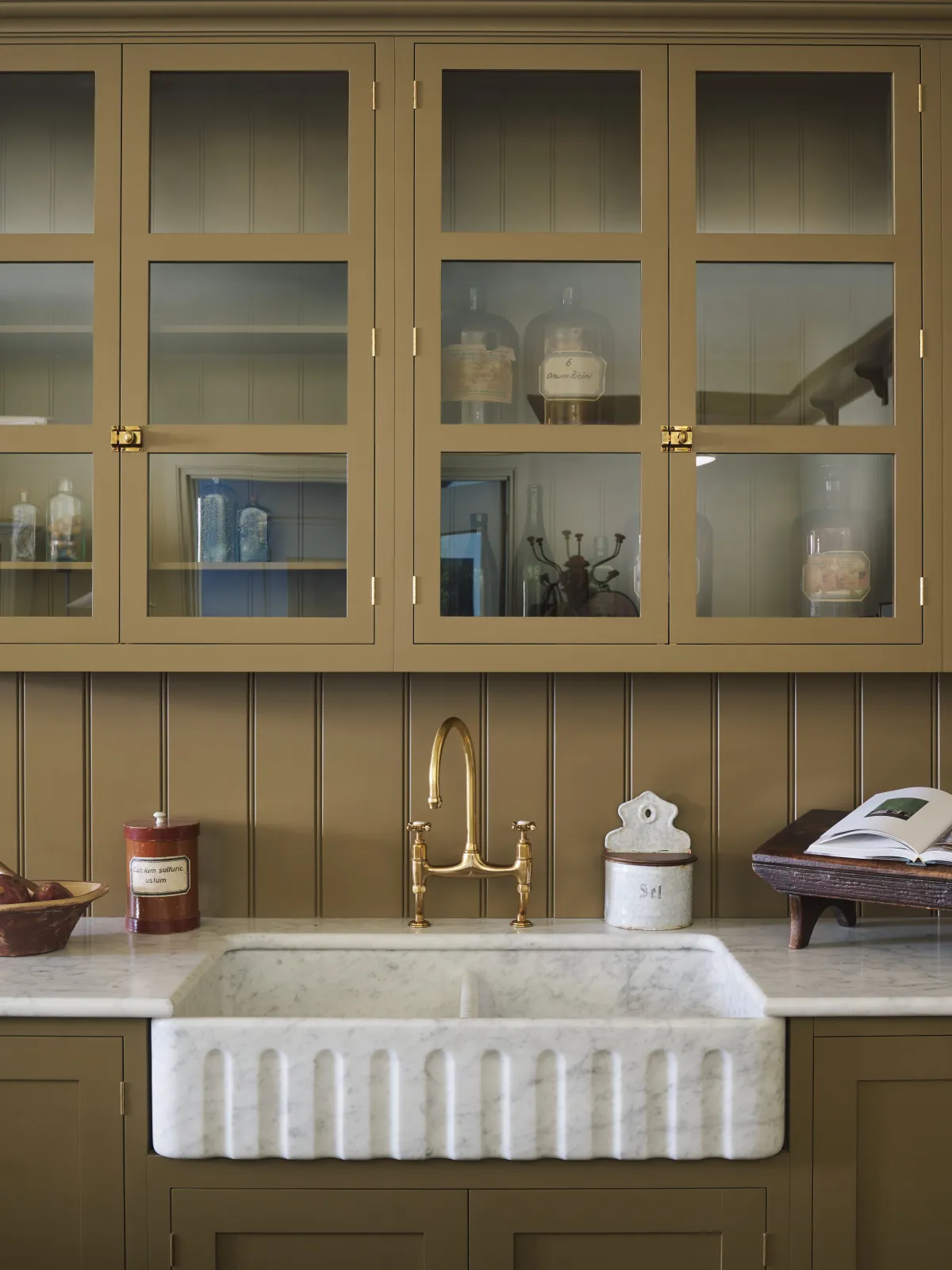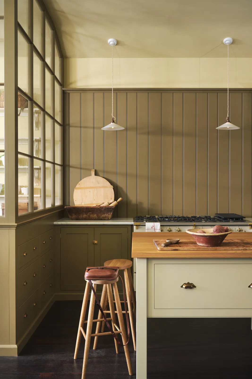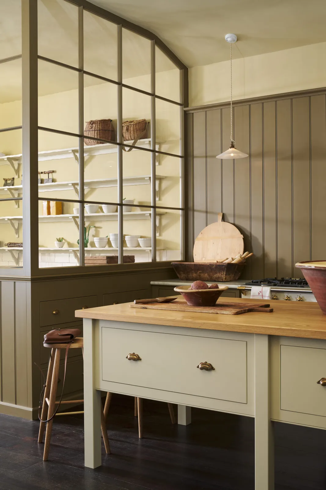The colour palette is reminiscent of big old London houses (particularly in Spitalfields, East London) where the kitchen was a working space and needed to be practical. So muddy, greeny browns and dark wooden floors, give a sombre and sturdy feel to the furniture and panelling. There is something quite alluring about these kinds of colours, they feel almost as if the room chose them rather than a person, which makes it all feel very authentic.